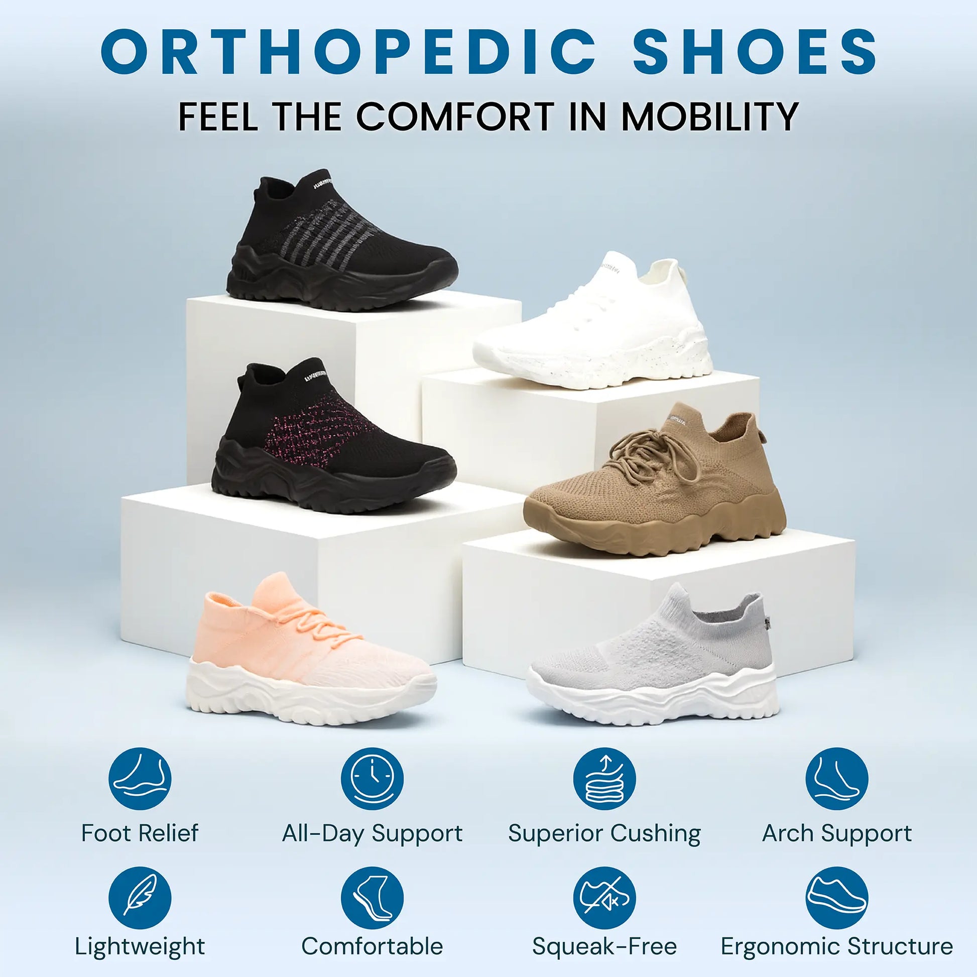 Our orthopedic shoes are clinically designed to relieve pain from common foot conditions like plantar fasciitis, bunions, and everyday strain. With superior cushioning, arch support, and ergonomic structure, they help you stay on your feet longer, with comfort, confidence and without pain!